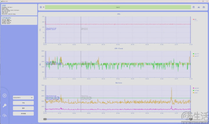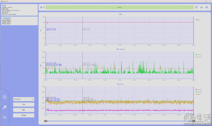 在打开Q2芯片的超帧超分功能后,此时iQOO Neo11的游戏帧率在监测软件里表现出了奇怪的“高位震荡”特征,在130FPS和120FPS之间“反复横跳”。这可能是它的超帧算法在我们测试时未能完美适配,但开启超帧超分后功耗不升反降的表现,依然证明了iQOO自家“独显芯片”的功力。