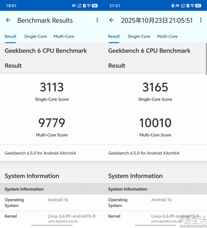 GeekBench 6.5 常温(左)与低温环境(右)跑分成绩